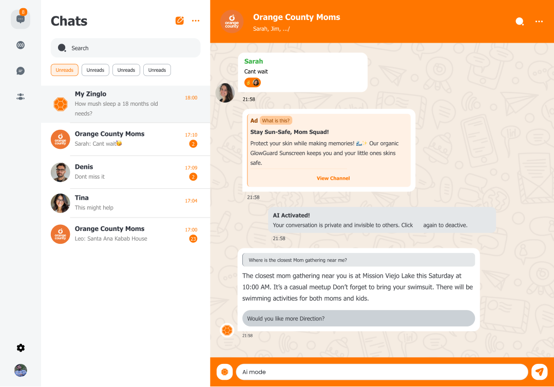 Canal de plataforma de mensagens com tecnologia de IA da Zinglo, grupo inteligente e agente de IA