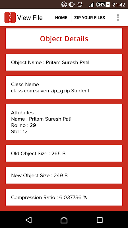 This Application allows user to compress and decompress data in order to avoid wastage of memory.Zip is used compress files like text file,image file,audio/video files,etc. App allows user to select file from assets folder or through device.If you are transferring large objects over sockets then, in order to improve the performance of your application, you may want to compress the objects before sending them across the network and decompress them at the destination. The Gzip is more appropriate as it operates on a single stream of data. So, Gzip is used to compress and decompress objects.