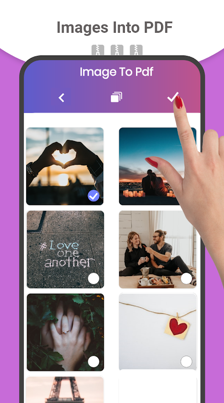 Imagem para PDF: esse recurso é a beleza deste aplicativo. Ele tem um botão de seleção na parte superior central para selecionar tudo em um toque para converter. Assim que você finaliza sua seleção, você pode alterar a sequência de fotos selecionadas, arrastando para cima ou para baixo para classificar a lista. Você está pronto para converter em pdf.