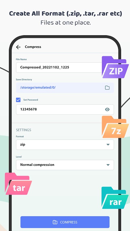 - Selecione vários arquivos e compacte-os com vários formatos como .zip, .7z, .tar e .rar e vários níveis como Normal, Fast, Fastest, Maximum, Ultra e Store.