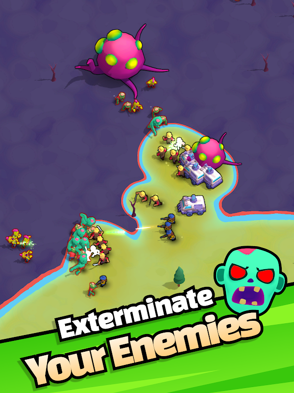 Produza recursos, aprimore suas construções, recrute unidades e lance ataques contra ninhos de zumbis.