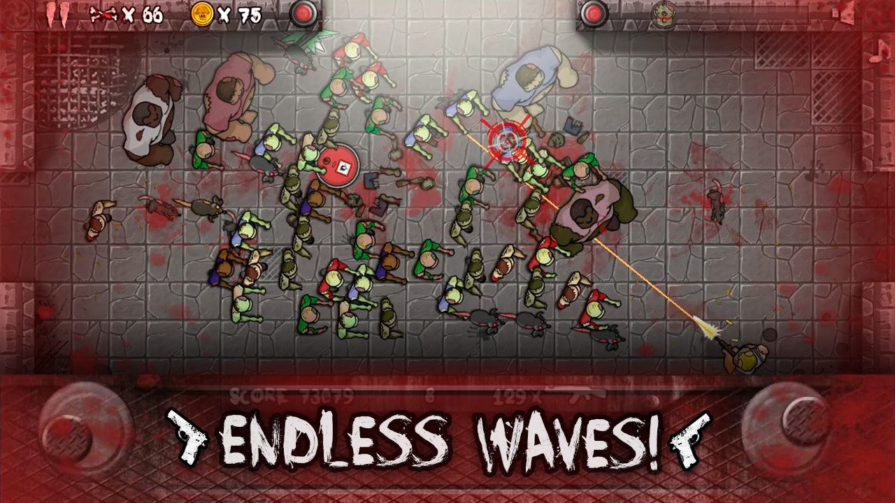 ZUMBIS!! Ondas após ondas de zumbis cercam você enquanto você luta por sua vida! A morte é iminente, mas use uma variedade de armas e power-ups para durar o maior tempo possível. Esses caminhantes começam lentos e inofensivos, mas depois de apenas algumas ondas você estará correndo para salvar sua vida!