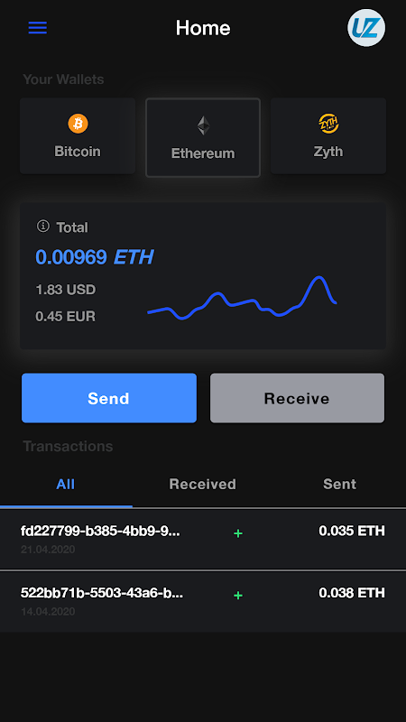 O usuário individual pode enviar ou receber btc, eth e zyth do aplicativo.
