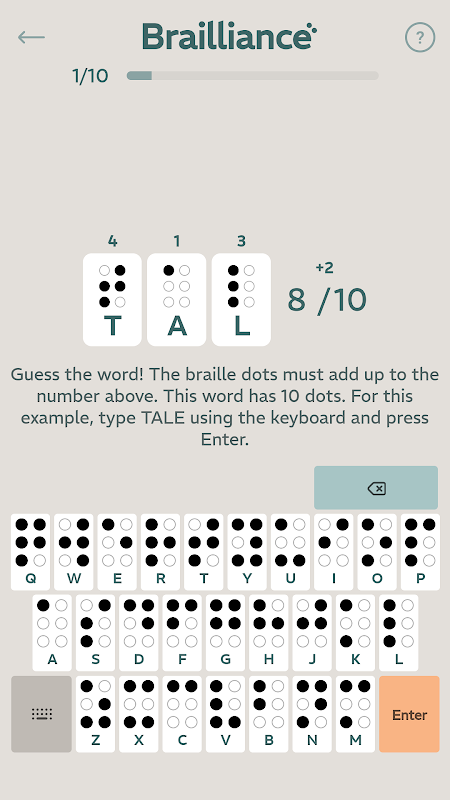 Brailliance is a puzzle game where you guess the word by adding up braille dots.