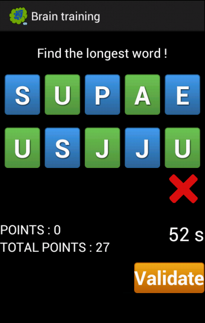 The first way consists in playing with letters. You have one minute to find the longest words existing with ten given letters. This can be really hard, and you have to imagine a lot of combinations with the given letters in order to find the longest word you know. At the end of the minute, the longest word you found is kept, and your total score is added by as many points as the longest word length (if you have found a 4 letters word, you will get 4 more points to your total score). After that, it restarts with 10 new letters, and it is up to you to find the new longest word ! You will see, it is very addictive... Try to beat the best scores posted, even if it will be harder and harder.