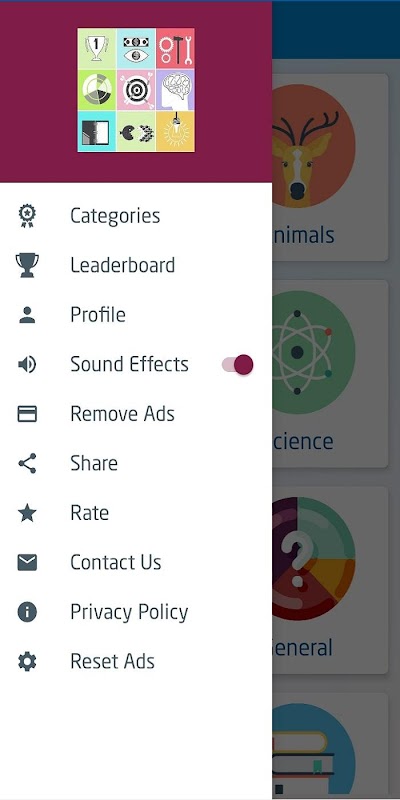 Navigation Drawer list include:(Levels, Sound Effects, Remove Ads, Share, Rate, Contact us, Privacy Policy, Reset Ads).