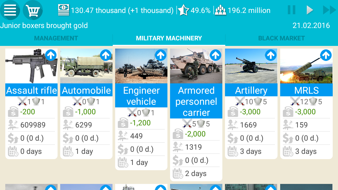 - Conduct army drills (there more than 10 kinds of military weaponry available to you).