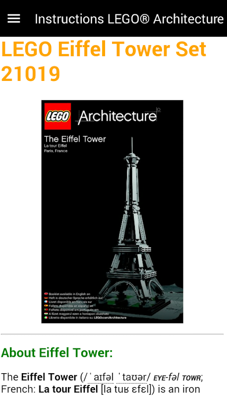 Build amazing buildings & landmarks using LEGO® bricks, with this app you can find all LEGO® Architecture sets instructions categorized neatly and with extra information and photos for every building.