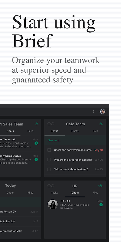 Brief brilliantly combines team chats, team hubs, video calls, to-do-lists, file sharing and storage —helping you prioritize high leverage actions. Featuring a clutter-free, minimalist design.