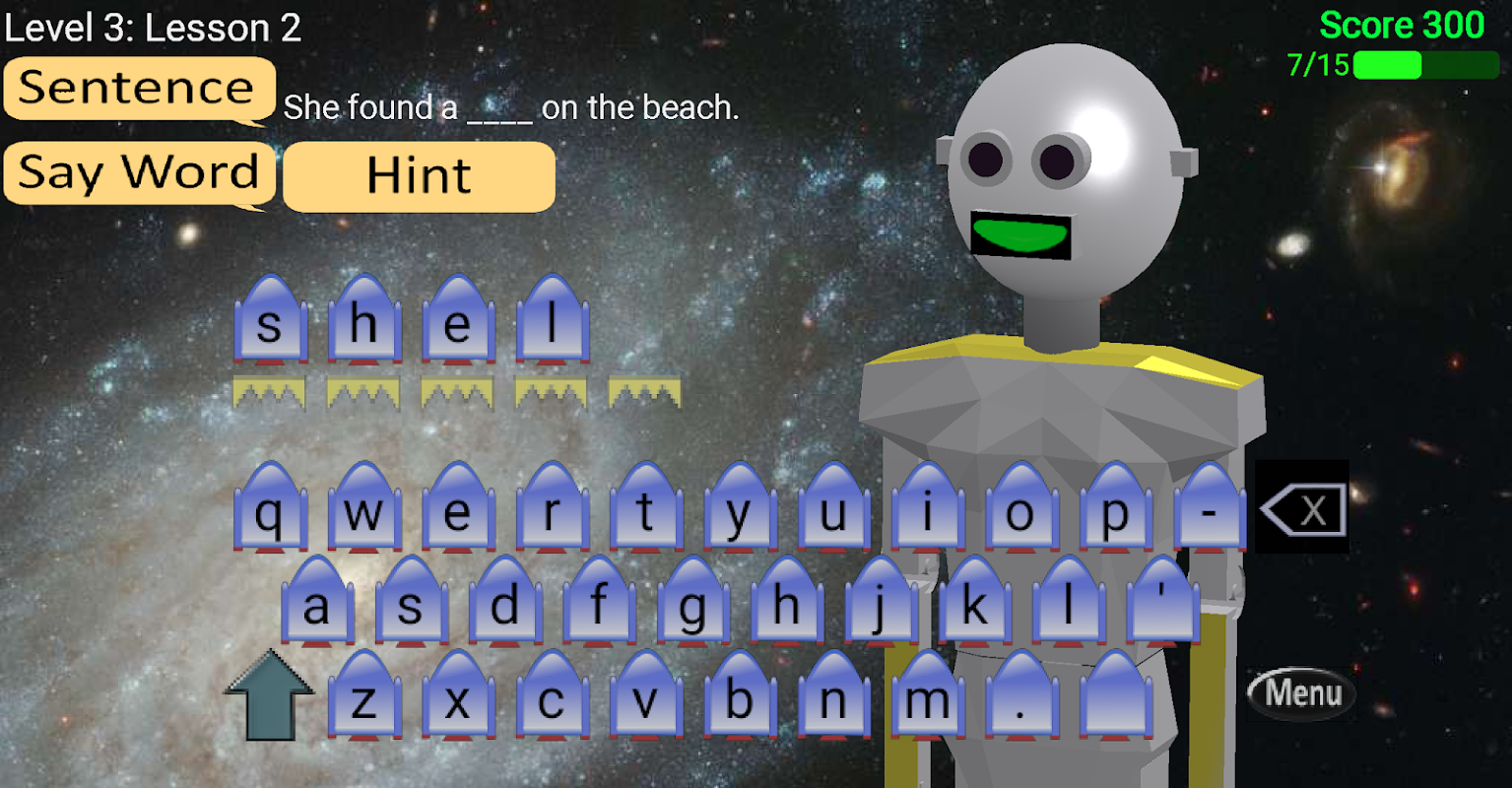 Brilliant Spelling works like this: Start by entering your name. From then on WordBot refers to you by name. WordBot uses text-to-speech with an Android voice to talk to the user. What happens next is almost magical. WordBot makes friends with you as it steps through the spelling levels. It is a two way interaction with you entering words and tapping the buttons, and the tutor talking and drawing you in. You have to try it to believe it.