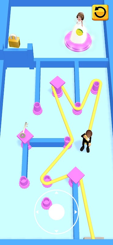 Use the joystick to control the groom and wrap around pillars to collect the ring & suit. Mind the obstacles!