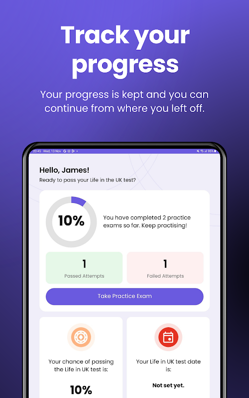 Are you looking forward to passing the Life in the UK Test only once? Our app makes it easy and fun to achieve this feat. After practising with over 500 questions and taking more than 20 practice tests, you'll feel super ready for the test!