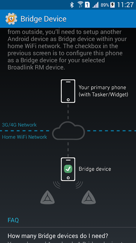 You can control your Broadlink RM devices even from outside of your home WiFi network, as a Tasker plugin or a homescreen widget. You'll simply need to enable a Bridge device within your home WiFi network. Refer to screenshot and in-app FAQ for more details.