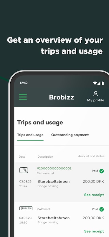 With the Brobizz app, as a private customer, you can easily and quickly check whether your number plate payment and bizz are active and get an overview of your trips and usage – whether you've crossed the Storebælt Bridge, the Øresund Bridge, or traveled by ferry.