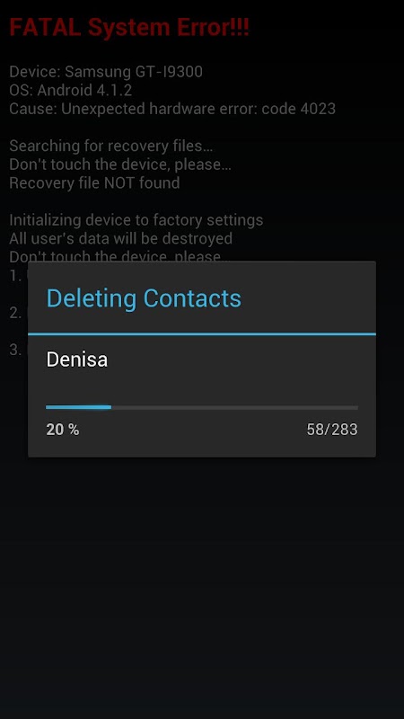 This app pranks people by simulating system failure followed by destroying all device’s data. But you don’t have to worry. It only shows the messages but doing absolutely nothing to your device.
