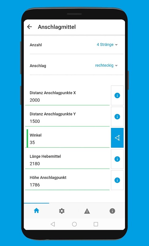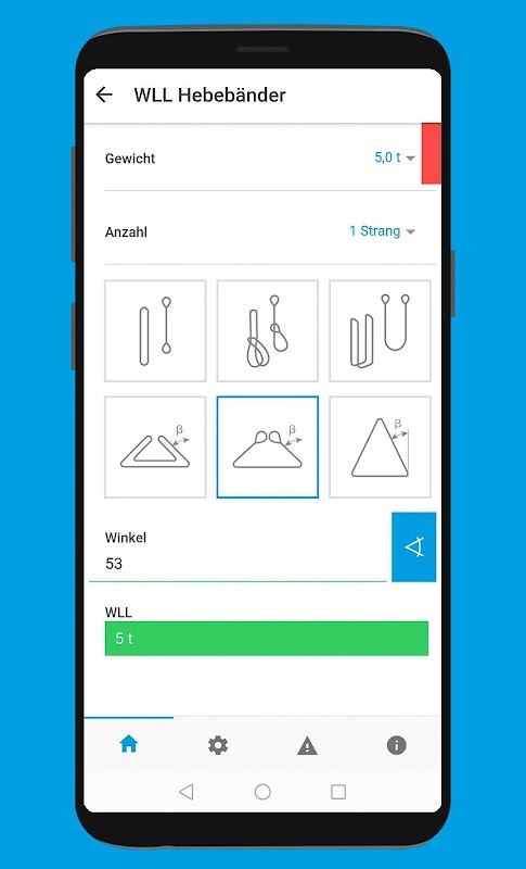 This App provides a combined tool for calculating the β stop angle and the length of the sling to quickly and easily find out whether the maximum permitted β angle stop is adhered to and which length of the sling is to be used in view of the given number of ropes and the given dimensions of the load.