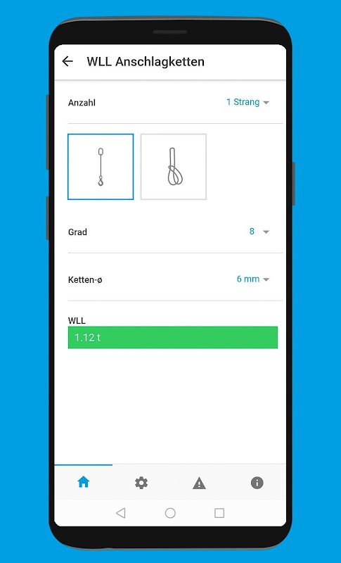 In addition, this App provides the three tools WLL Rope Slings, WLL Chain Slings and WLL Lifting Belts enabling the user upon entering the appropriate parameters to promptly establish the Working Load Limit (WLL) that the selected sling is permitted to lift given the angle determined.