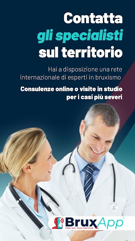 The platform provides the tools to accompany you on a complete support journey. It helps you in the evaluation of bruxism and its management thanks to an independent behavioral re-education path. Furthermore, it follows you in the follow-up and gives you the opportunity to come into contact with an international network of doctors and specialists who are experts in the subject. In fact, you can request online telemedicine consultations or in-person visits to dentists, physiotherapists, psychologists and pediatric dentists.