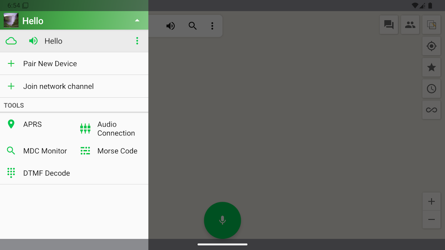• Floating on-screen widget on the Home screen showing device status and a PTT (push-to-talk) button.