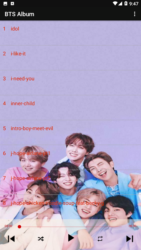 bts i need u, bts wake up, love myself bts dan ada lagu tambahan young forever bts, bts just one day , lee so ra ini sangat enak didengarkan tiap hari sambil santai maupun sambil kerja.