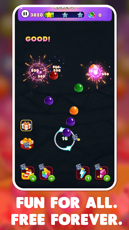 Use Fireballs, Bombs, Rainbow Bubbles, and Lightning to overcome challenging puzzles. Boosters are earned through gameplay and designed to support progression.