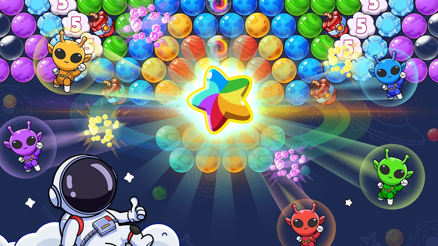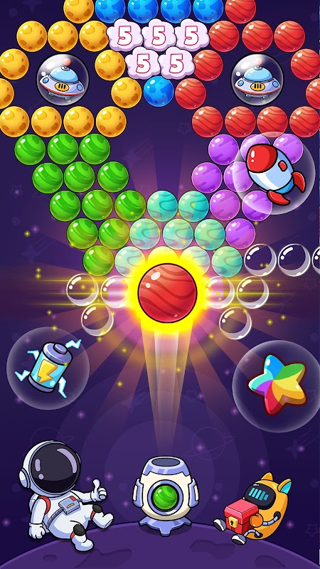 Your mission is to join the bubble shooter journey with an astronaut 🧑🏻🚀 and a cute cat robot 🤖, help them liberate planets 🪐, defeat alien monsters 👾, free the friendly aliens 👽 and rescue their spaceships 🛸!