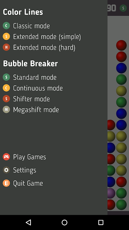 The Color Lines game contains three modes: classic (9x9, 5 balls), simple extended (9x17, 4 balls, dice ball, magic ball, numerical balls, bomb ball), hard extended (9x17, 5 balls, dice ball, magic ball, numerical balls, bomb ball).
