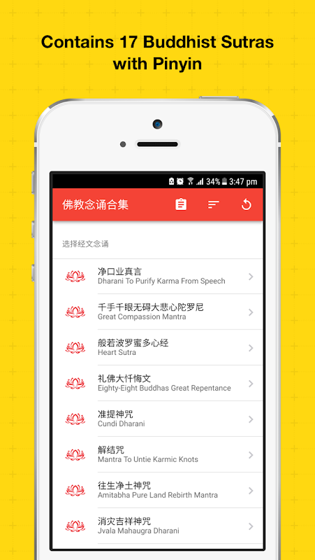 This app contains 17 Mahayana Buddhist Sutras with Pinyin and Tally Counter.