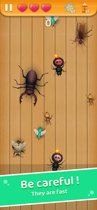 The game is really easy, just tap on the insects to smash em. You have 3 hearts, each time you let an insect go through or when you press on bomb bug, you'll loss a heart. Try smash em as fast as possible but also try avoiding the bomb bug.