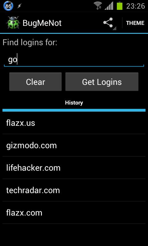 BugMeNot for Android is an Android application for www.bugmenot.com which allows you to quickly bypass the login of web sites that require compulsory registration.