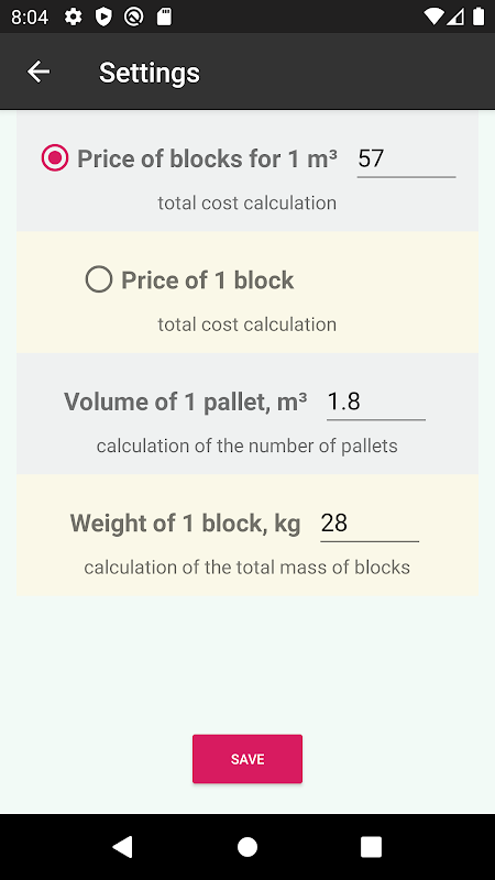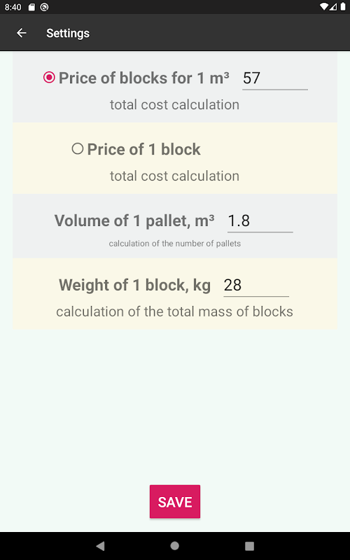 *Multiple to the number of pallets - in this calculation, the program rounds the number of pallets to an integer and makes an alternative calculation based on this. Usually this calculation is necessary when you buy blocks from the factory, when it is not possible to buy building blocks separately.