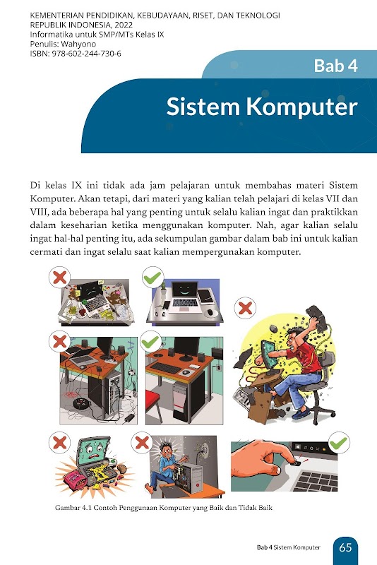 Informatics is a field of science regarding the study, design and creation of computing systems, as well as the principles that form the basis of such design. As in classes VII and VIII, Informatics subjects are divided into several elements, namely: Computational Thinking (BK), Information and Communication Technology (ICT), Computer Systems (SK), Computer Networks and the Internet (JKI), Data Analysis (AD), Algorithms and Programming (AP), Social Impact of Informatics (DSI), and Cross-Sector Practicum (PLB). In this case, Computational Thinking is the basis for thinking for learning Informatics.