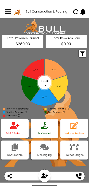 Bull Build is a free app available for anyone to download and is used for those that want to earn rewards by sending referrals to Bull Build. It is as simple as downloading the App, selecting the sales rep and registering. Once registered, you can begin sending referrals right away. It is the one app that will allow the user to easily submit referrals to Bull Build and track the progress of your referral and rewards right on your mobile device. Referring has never been so easy.