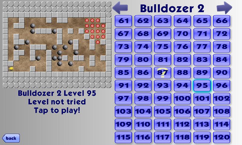 The classic "Push the boulders" game is now available for Android phones and tablets! This version includes every level from the original Bulldozer 1, Bulldozer 2, and Bulldozer 3. That's 180 levels of addictive rock-pushing obsession. Have fun!