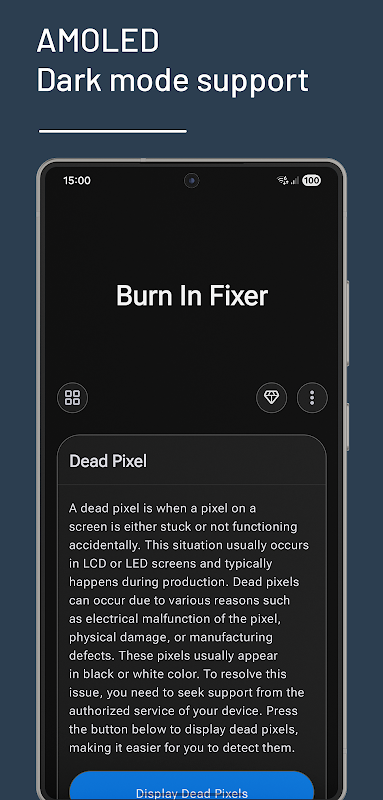 This application does not guarantee that it will fix the issues on your screen. It only has the potential to work on mild cases of screen burn-in and ghost screen. The app does not repair dead pixels; it only helps you detect them. If the issue is severe, physical, or persistent, please contact your device’s authorized service center.