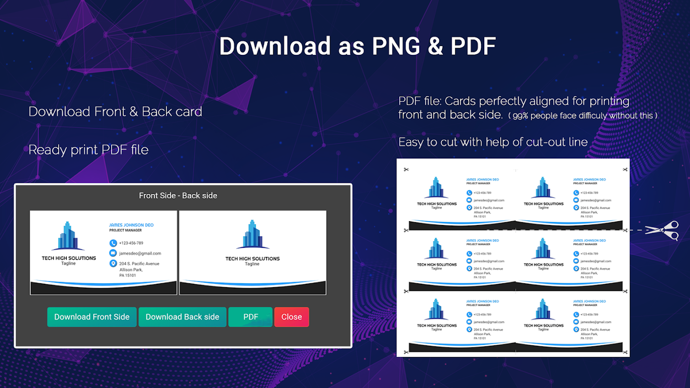 - 2 simple steps. Fill the profile page (name, address, phone) and choose visiting card template. Your business card is ready to download
