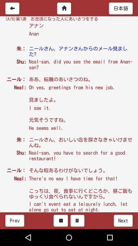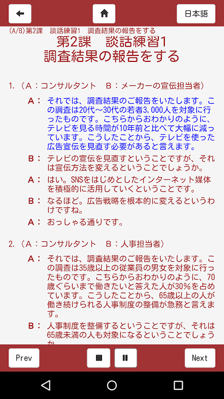 To be most effective, this App should be used in conjunction with the book “Practical Japanese Conversation for Business People – Intermediate 2.” However, it can be used even without the book.