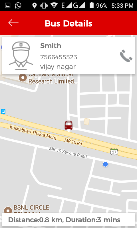 > User can track complete details of Driver, Bus and can call the driver if needed.