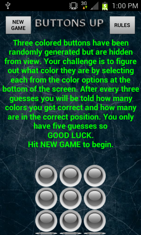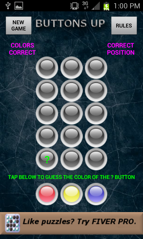 Three colored buttons have been randomly generated but are hidden from view. Your challenge is to figure out what color they are. After every row of guesses you will be told how many colors you got correct and how many are in the correct position. GOOD LUCK!