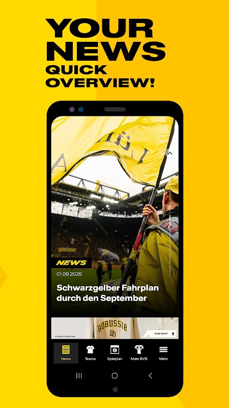 News: The app's start screen shows you the most relevant news, videos, and social media posts about BVB. Swipe up and down to be up to date immediately and discover all news.