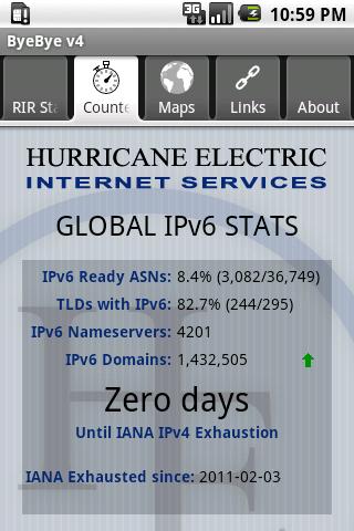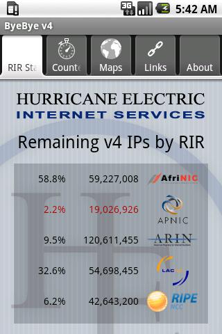 IPv4 addresses are running out. Estimates currently have the available IPv4 address pools allocated to the regional registries running out starting in 2011. Track the rate of IPv4 allocations and IPv6 adoption easily with this application.
