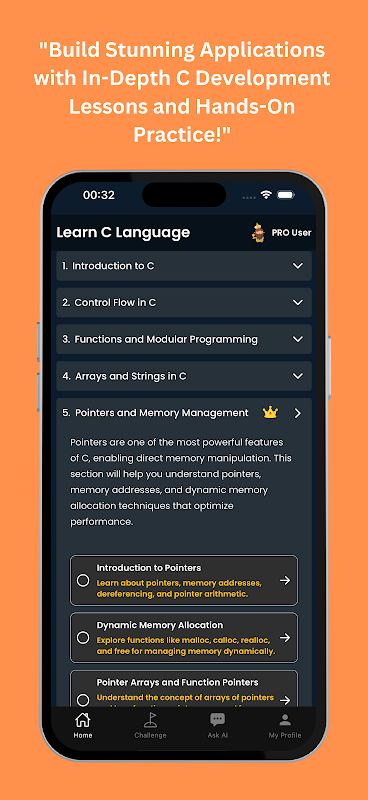 AI-Powered Learning: Our intelligent AI tutor walks you through every C concept, from basic syntax and variables to pointers, memory management, and data structures. Confused about pointers or segmentation faults? The AI explains each concept step by step, with clear examples and helpful visuals. You’ll get personalized learning paths based on your progress, so you're never overwhelmed or left behind.
