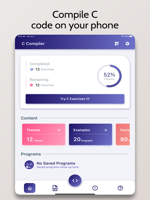 C Compiler is an Advanced IDE enabling you to compile C Programs on your Mobile Phone for Free. It comes with a code editor with in-built syntax highlighting capabilities.