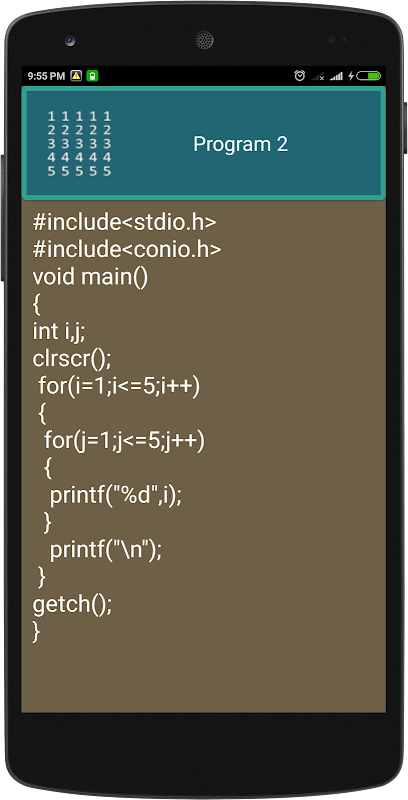 These program prints various different patterns of numbers and stars. These codes illustrate how to create various patterns using c programming. Most of these c programs involve usage of nested loops and space. A pattern of numbers, star or characters is a way of arranging these in some logical manner or they may form a sequence. Some of these patterns are triangles which have special importance in mathematics. Some patterns are symmetrical while other are not. Please see the complete page and look at comments for many different patterns.