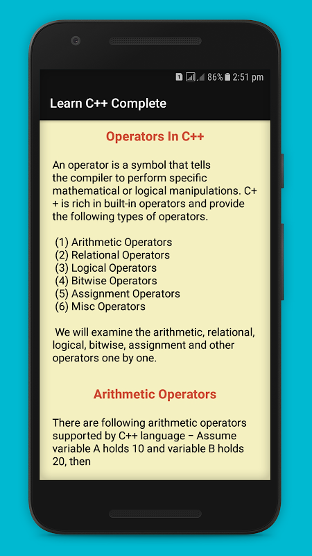 This advanced C++ Tutorial application gives you the opportunity to carry C++ tutorials on the mobile phone.