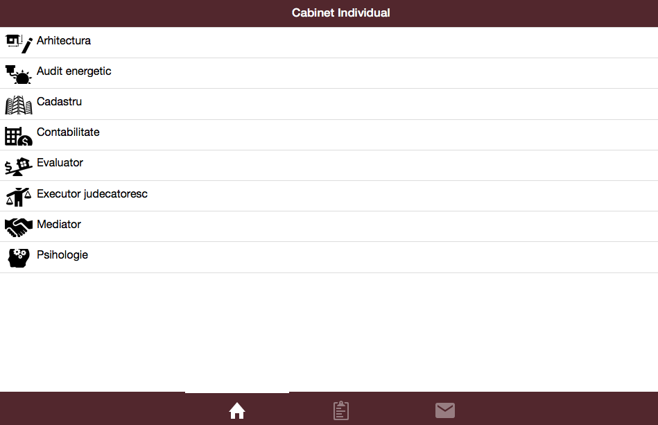 Cabinet Individual application connects the individual offices of psychology, architecture, mediation, assessor, land, accounting, energy audit, bailiff and customers in Romania. We in contact with one individual cabinet in most cities where dedicated people practicing their skills and experience. We believe in professionalism and experience. Cabinet Individual application hosting computer system operates and as such, objectively, be liable for the content of material or effects that might occur in the public plan.