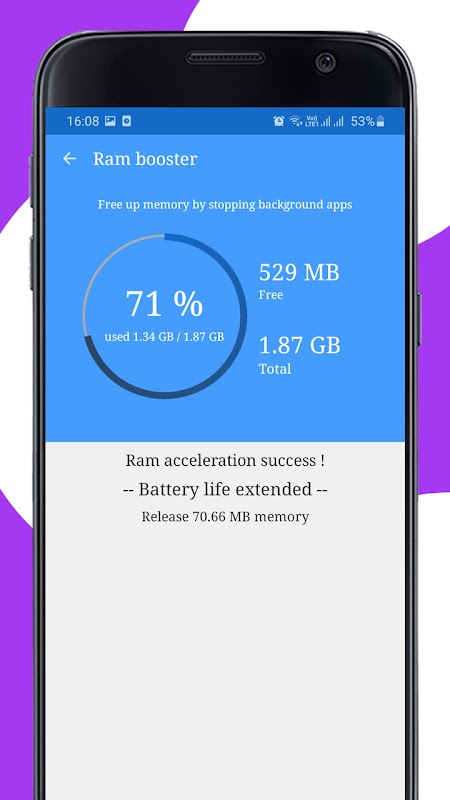 + Ram cleaner for Android is a tools to clean up and delete ram space, helping you to optimize space on your smartphone.