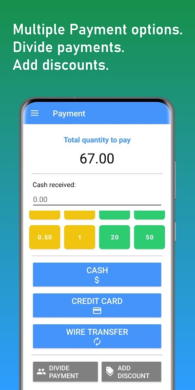 Cafe-POS is a fully functional POS system. Calculate the total for an order and receive the payments by cash, credit card or wire transfer.