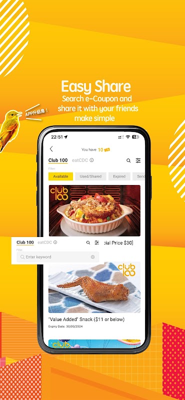 Easy Share: Share Club 100 e-Coupons with friends and view your eatCDC e-Coupons in app wallet