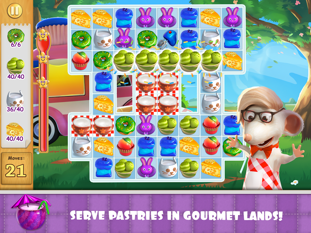 Embark on a mouth-watering match-3 picnic! Drive your bakehouse-on-wheels through gourmet lands and serve all kinds of sweet desserts. We’ve got the most exquisite three-in-a-row challenges, the best baking ingredients for you to collect, and unforgettable non-culinary tasks to tease your brain!